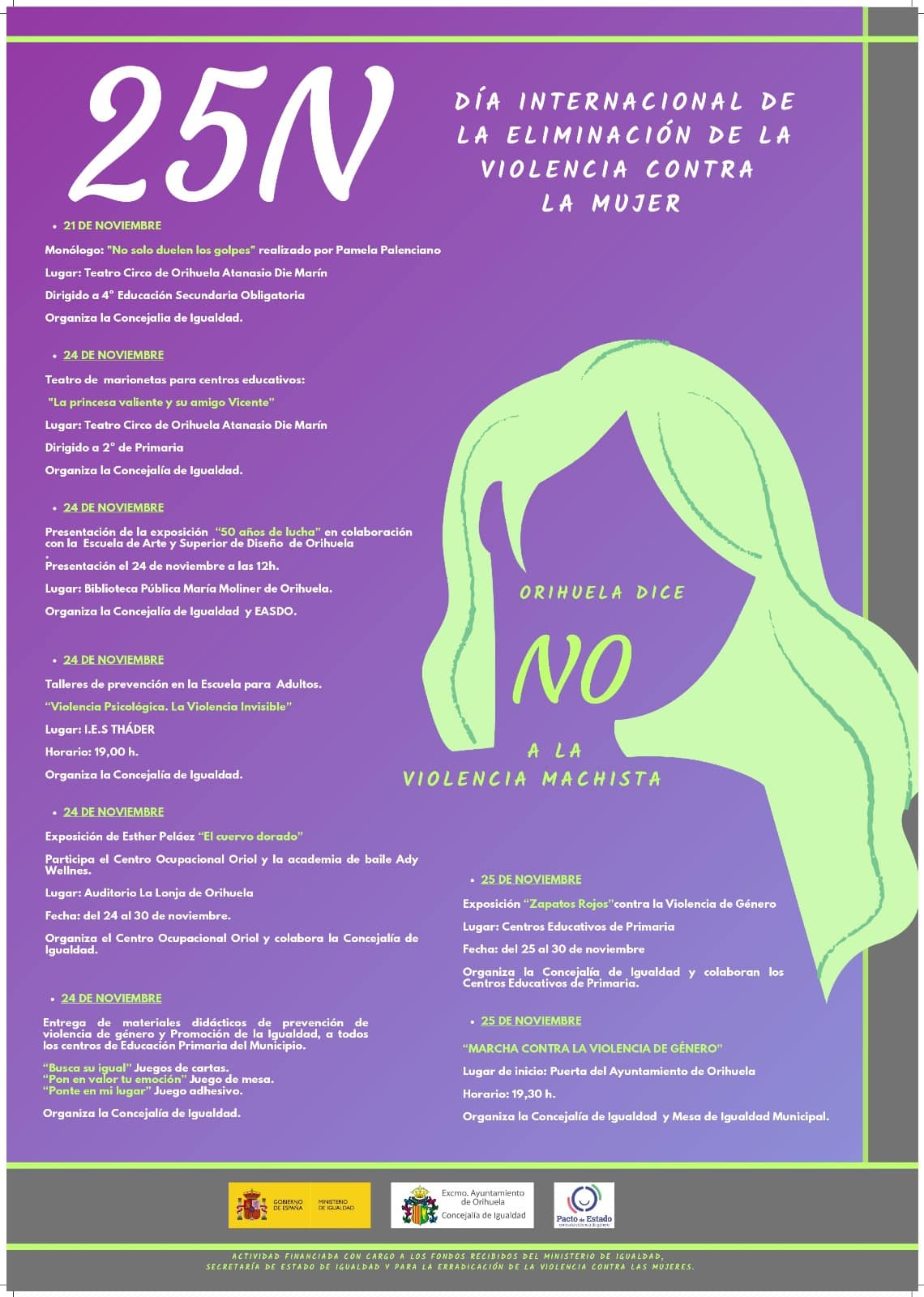 Orihuela, España – 21 de noviembre de 2025 - Departamento de Igualdad del Ayuntamiento de Orihuela, dirigida por Agustina Rodríguez, ha anunciado su programa para el Día Internacional de la Eliminación de la Violencia contra la Mujer. (25 de noviembre), bajo el lema: “Orihuela dice NO a la violencia de género.”
