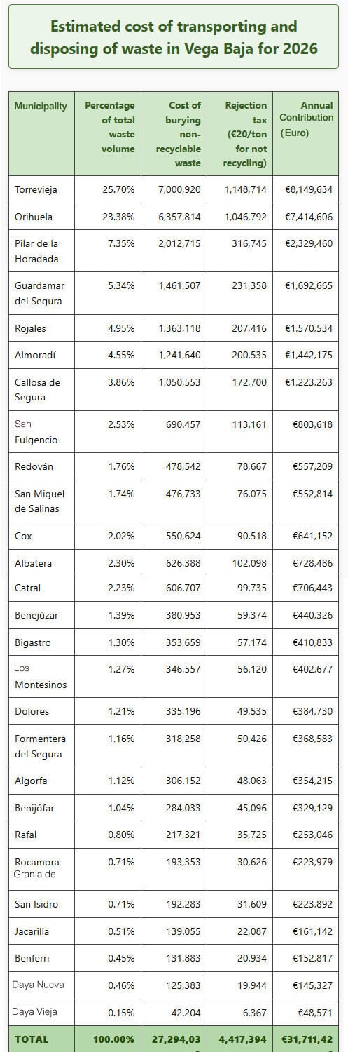 La Vega Baja se prepara para una factura récord de 31.7 millones de euros el año que viene solo para llevarse su basura. Eso es 204,000 toneladas de residuos encaminado a doce vertederos en cinco provincias, y podría aumentar aún más debido a los exorbitantes costos del transporte y a la falta de instalaciones de tratamiento locales.
